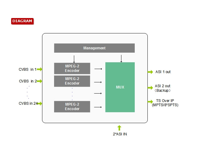 DMB-9312 MPEG-2 24-Channel SD Encoder is a broadcast level encoding platform that adopts advanced compression technology with features of ultra-low bit rate and low latency. It can provide high quality images even at low bit rate. DMB-9312 is integrated with 24 channels. Provided with an external 2*ASI input, it can be multiplexed with the local multi-programs to eliminate the needs of multiplexers, and also cascading with several encoders, to simplify the network architecture for high reliability solutions. The device supports output interfaces of ASI and IP(TSoIP) out, while the TS over IP out provides 1*MPTS or 24*SPTS over IP change by software. DMB-9312 is coupled with user-friendly NMS, to be easily upgraded via software to add new functions or improve features and enhance performance. It is the preferred device for DTV service providers and customers for its unrivaled performance, flexibility, advanced compression and high affordability per channel.