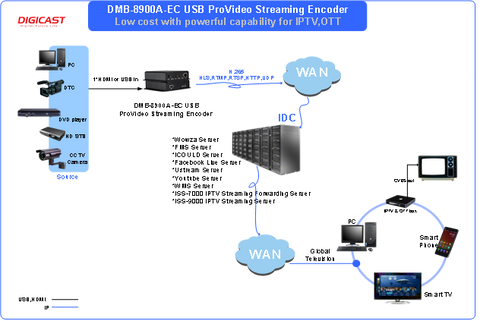 OVERVIEW DMB-8900A-EC USB series ProVideo Streaming Encoder features high performance, low latency and low bit rates for IPTV/OTT systems, realized Video & Audio real-time transmission via internet, and adopts state-of-the-art compression technology of H.265/H.264/MJPEG, which realizes HDMI resolution to be up to 4K @30,USB support capture YUV camera supports up to 1080P60 frame...
