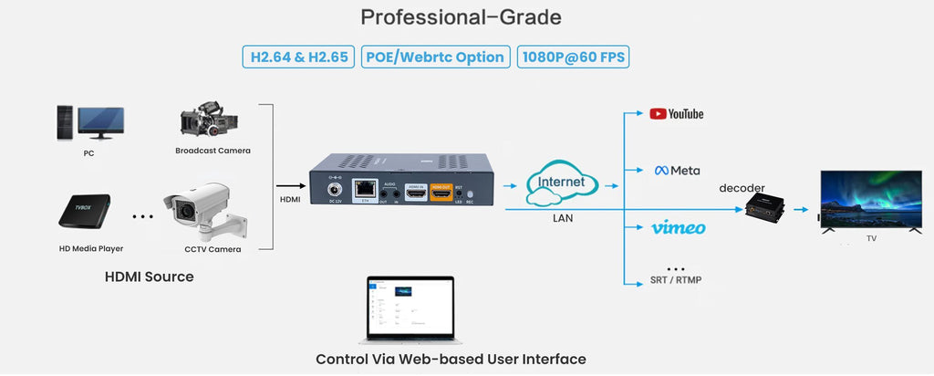 The DMB-8900A-L HD encoder has the function of encoding four streams simultaneously. HDMI video source encoding can be compressed into a network stream, and long-distance HD transmission/live broadcast of video can be realized over the Internet or LAN through a wired network.With newest technology WebrtC (option) push streaing over WAN,Ultra-low latency across the network ≤ 300ms viewing.