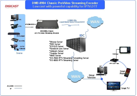 Digicast multiscreen multiprotocol series IPTV Encoder are designed to address the increasing demand for video delivery to Internet and mobile devices. DMB-8904 Classic H.265 HEVC, H.264 HD 4 Channel IPTV Encoder supports audio and video collection by 4-Ch HD HDMI or 4-Ch SDI input simultaneously. For each channel input supports output 2 channels IP streams with two different resolutions (one higher resolution, the other one lower resolution), each channel of IP stream support two kinds of protocols output option.