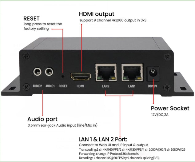 It can also decode online network video streams (such as: rtsp://.... http://.... rtmp://.... udp://@.... hls, etc.) to the device and then connect to a monitor or TV through HDMI output to restore the image.Besides it support 36 channels forwarding function, change the Ip protocol for IP transmission,it will not change the resolution,bitrate only change the IP protocol in forwarding function.