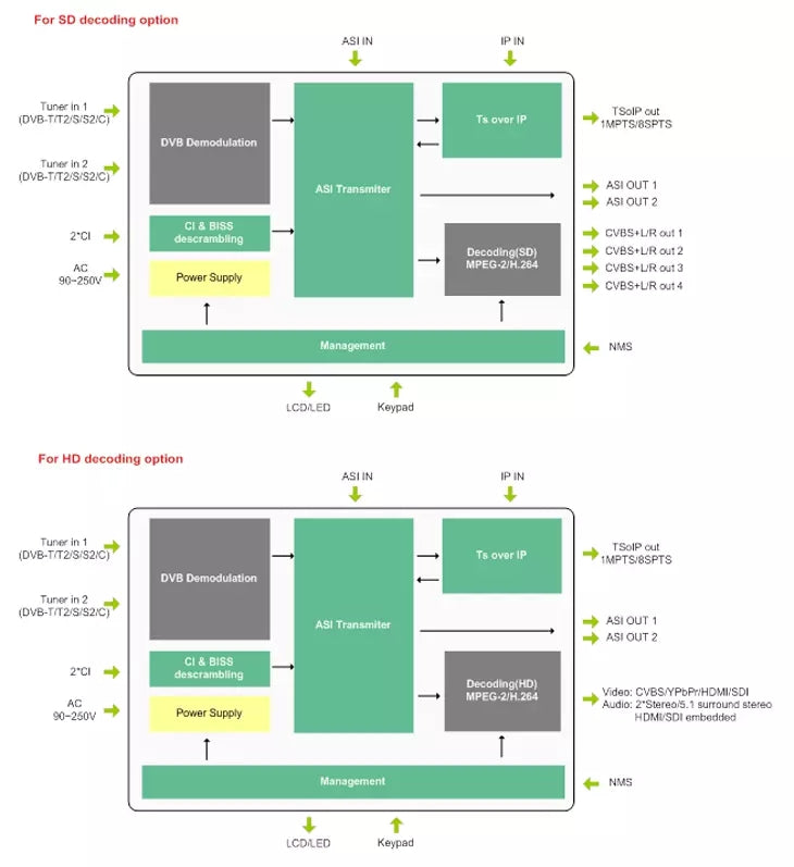 DMB-9060A Two-Channel Professional IRD is a high-density and flexible device, integrating broadcast level receiver, demodulation, decrypting and decoding function. It supports ASI,IP and various of Tuners input which can be selected respectively from DVB-S/S2, DVB-T/T2, and DVB-C with 2* Tuner independent input, and also capable of receiving lots of programs from different frequencies. DMB-9060A is designed in standard 1U Chassis, with a Hot-Pluggable modules (can support 2 channels). Meanwhile, it delivers reliable video quality program source with advanced video decoding (H.264 & MPEG-2) technology, outputs: TS*2(backup) +IP (1*MPTS or 8*SPTS with UDP/RTP/RTSP) and monitoring: 4*CVBS (Independent), 4*RCA(4*Stereo/8*mono). With its 2*DVB common interface slots and BISS decryption, capable of working with most of well-known CAS in the market to decrypt multiple TV pay services. With the compact design of 2*Tuner input and the excellent decoding ability, DMB-9060A is becoming very popular among distribution system, IPTV applications and digital TV head-end system for DTV operators, broadcast service providers and IPTV integrators etc.