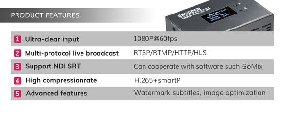 It features high performance, low latency and low bit rates for IPTV/OTT systems, realized Video & Audio real-time transmission via internet, and adopts state-of-the-art compression technology of H.265 HEVC. As encoder, it support video source through the local USB files, HDMI video or over Ethernet in normal protocol of HTTP/HLS/RTSP/RTP/UDP/RTMP/RTMPS, or in NDI|HX streams for use with other NDI|HX compatible systems, converte it to IP.