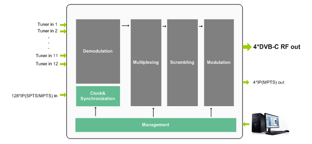 - Up to 12*DVB-S/S2 Tuners and 128*IP(MPTS/SPTS) in.