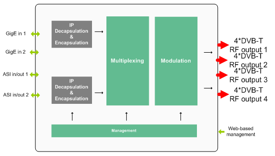 - 4 separate multiplexing and Up-converter modulating adjacent carrier out, Output RF standard support DVB-T/DVB-C/ATSC/ISDB-T/DTMB option from UI, only need reboot the device after switch the output RF standard