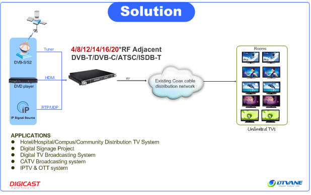 Tuner/RJ45 Port input, 4/8/12/16/20*RF out as per needs accordingly. Coming with professional and high cost-performance modulator for Digital TV headend.