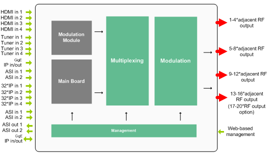 Each module data input: 4*HDMI / 4*Tuner (DVB-S/S2, DVB-T/T2, DVB-C, ISDB-T/Tb, ATSC-T, DTMB input for option, If DVB-T/T2, ISDB-T/Tb input, Max. support 12-Channel Input) / 4*RJ45 Port 100M Ethernet interface (Each port supports 32*IP (SPTS /MPTS) input, Total 128*IP) - Up to 3 independent modulation modules in rear panel(Second layer)