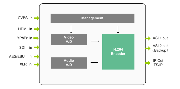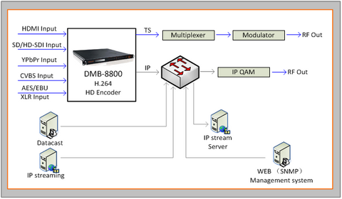 DMB-8800 MPEG-4 AVC HD Universal Encoder features high performance, low latency and low bit rates for DTV systems, and adopts state-of-the-art compression technology of H.264/AVC, which realizes its resolution to be up to 1080P. With powerful video pre-compression and efficient adaptive video compression algorithm, it is able to provide clear-delicate, high quality video even at lower bit rate. DMB-8800 is equipped with diversified input interfaces, including HDMI(support HDCP protocol), CVBS, YPbPr, HD-SDI/SD-SDI, digital AES/EBU and analog balanced XLR. Moreover, it has 1*ASI+1*ASI backup and IP(UDP/IP) output interfaces. The empty packets filtering capability of IP out not only enables it to provide more services in the limited bandwidth, but also largely enhance the utilization of spectrum source of IPTV system.